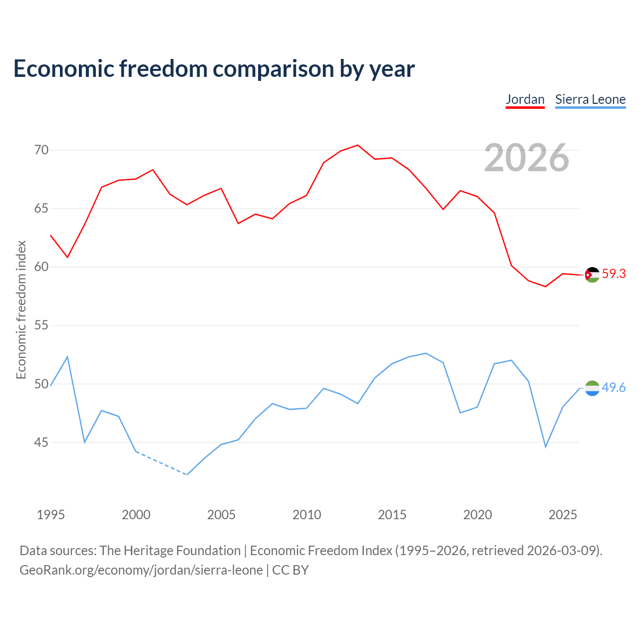 The Economic Freedom Index for Jordan is 59.3, ranking 104/197, compared to 49.6 for Sierra Leone, ranking 165/197. The chart above displays a comparison of annual changes in economic freedom indexes.