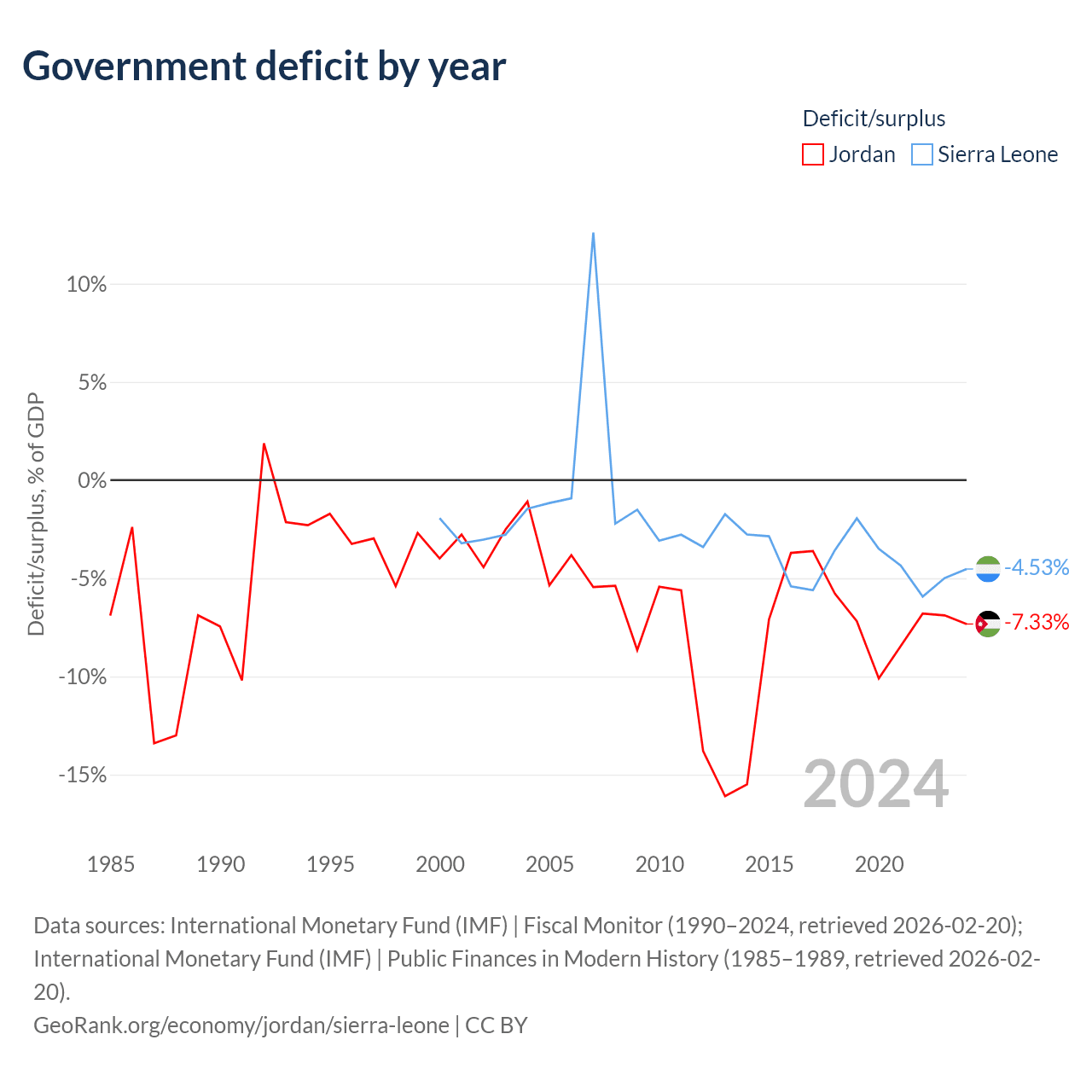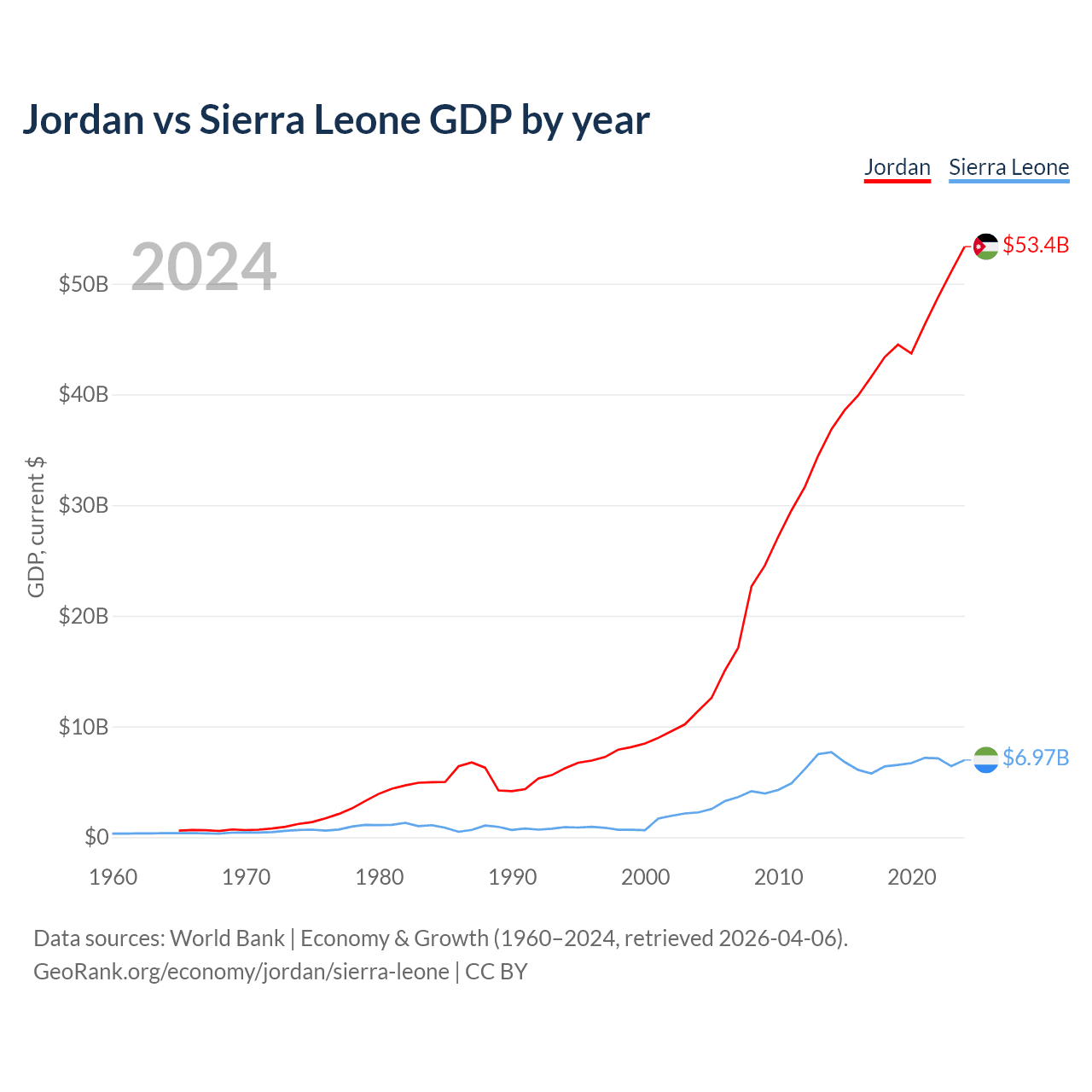 Jordan has a GDP of $53.4B compared to $6.97B for Sierra Leone, ranking 90/197 and 160/197 by economy size, respectively.