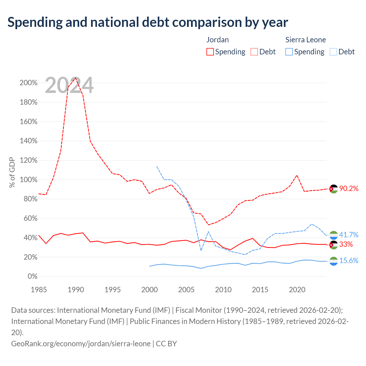 Jordan has $48.1B in government debt (90.2% of GDP), compared to $2.91B (41.7% of GDP) in Sierra Leone.