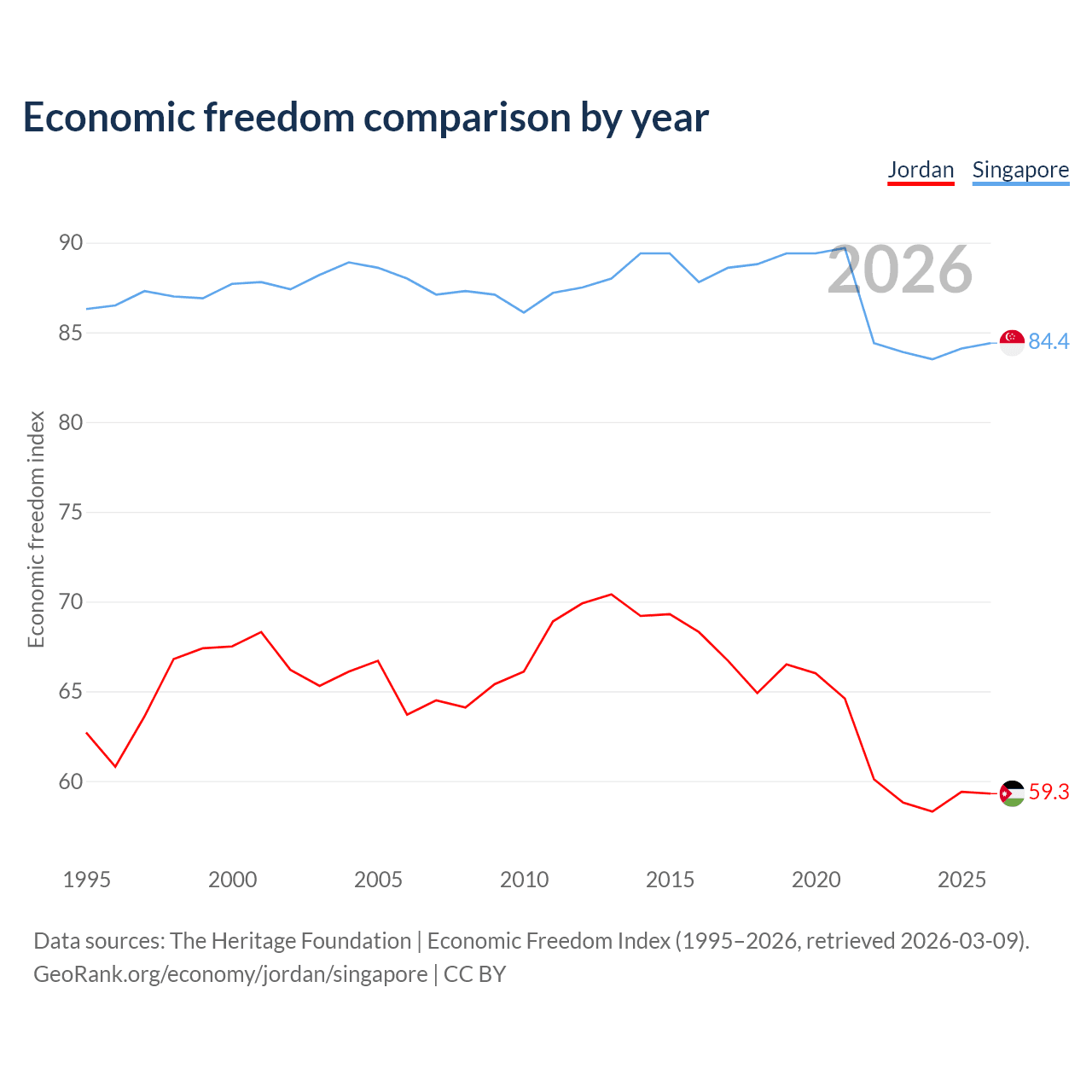 The Economic Freedom Index for Jordan is 59.3, ranking 104/197, compared to 84.4 for Singapore, ranking 1/197. The chart above displays a comparison of annual changes in economic freedom indexes.