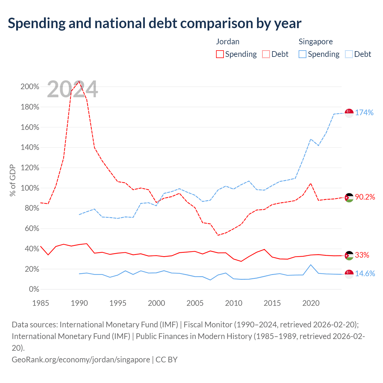 Jordan has $48.1B in government debt (90.2% of GDP), compared to $950B (173.5% of GDP) in Singapore.