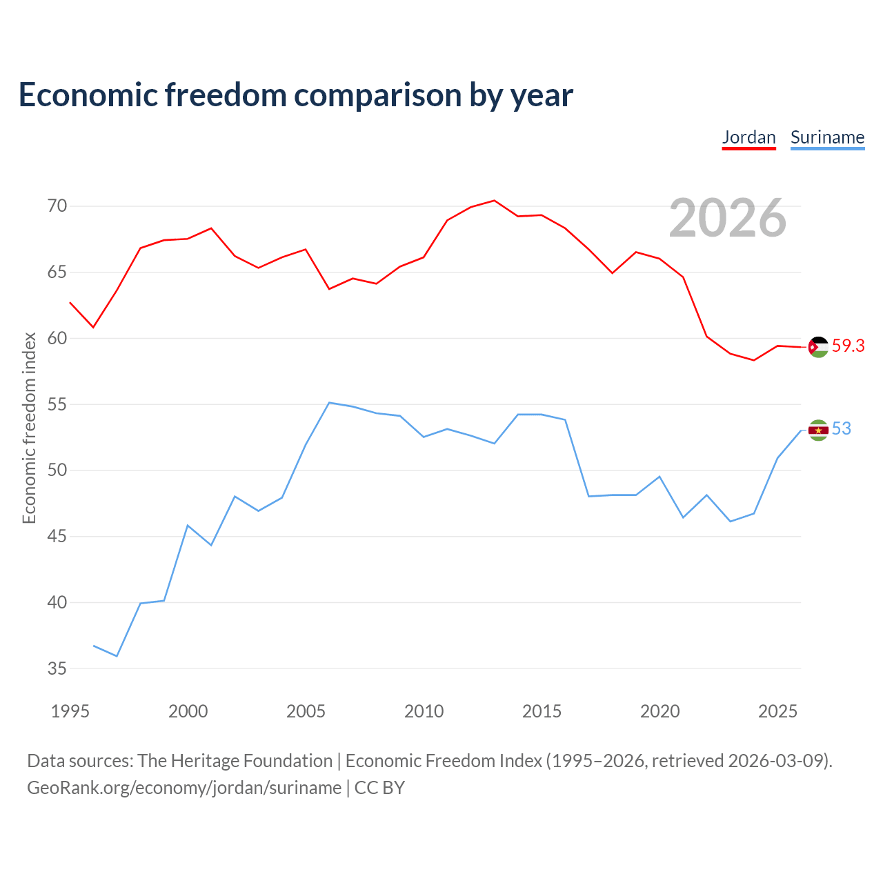 The Economic Freedom Index for Jordan is 59.3, ranking 104/197, compared to 53 for Suriname, ranking 143/197. The chart above displays a comparison of annual changes in economic freedom indexes.