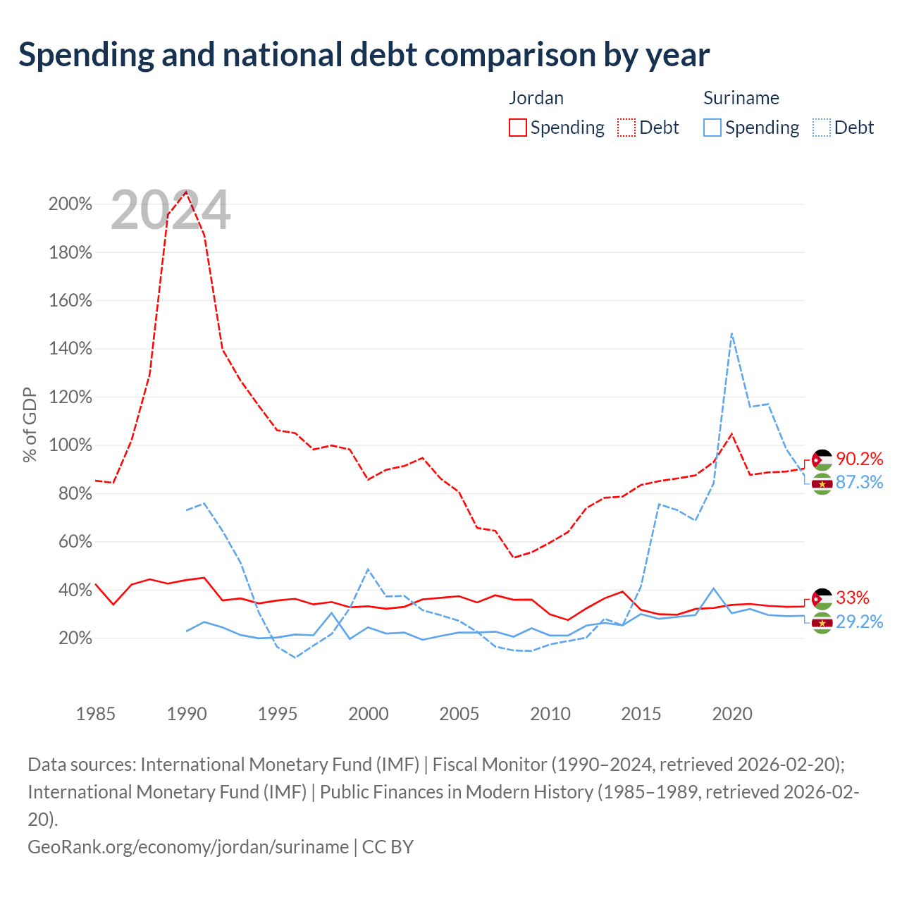 Jordan has $48.1B in government debt (90.2% of GDP), compared to $3.86B (87.3% of GDP) in Suriname.