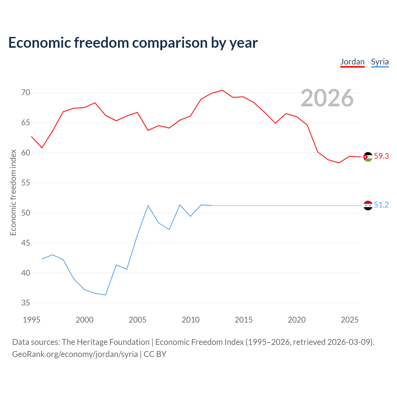 The Economic Freedom Index for Jordan is 59.3, ranking 104/197, compared to 51.2 for Syria, ranking 155/197. The chart above displays a comparison of annual changes in economic freedom indexes.