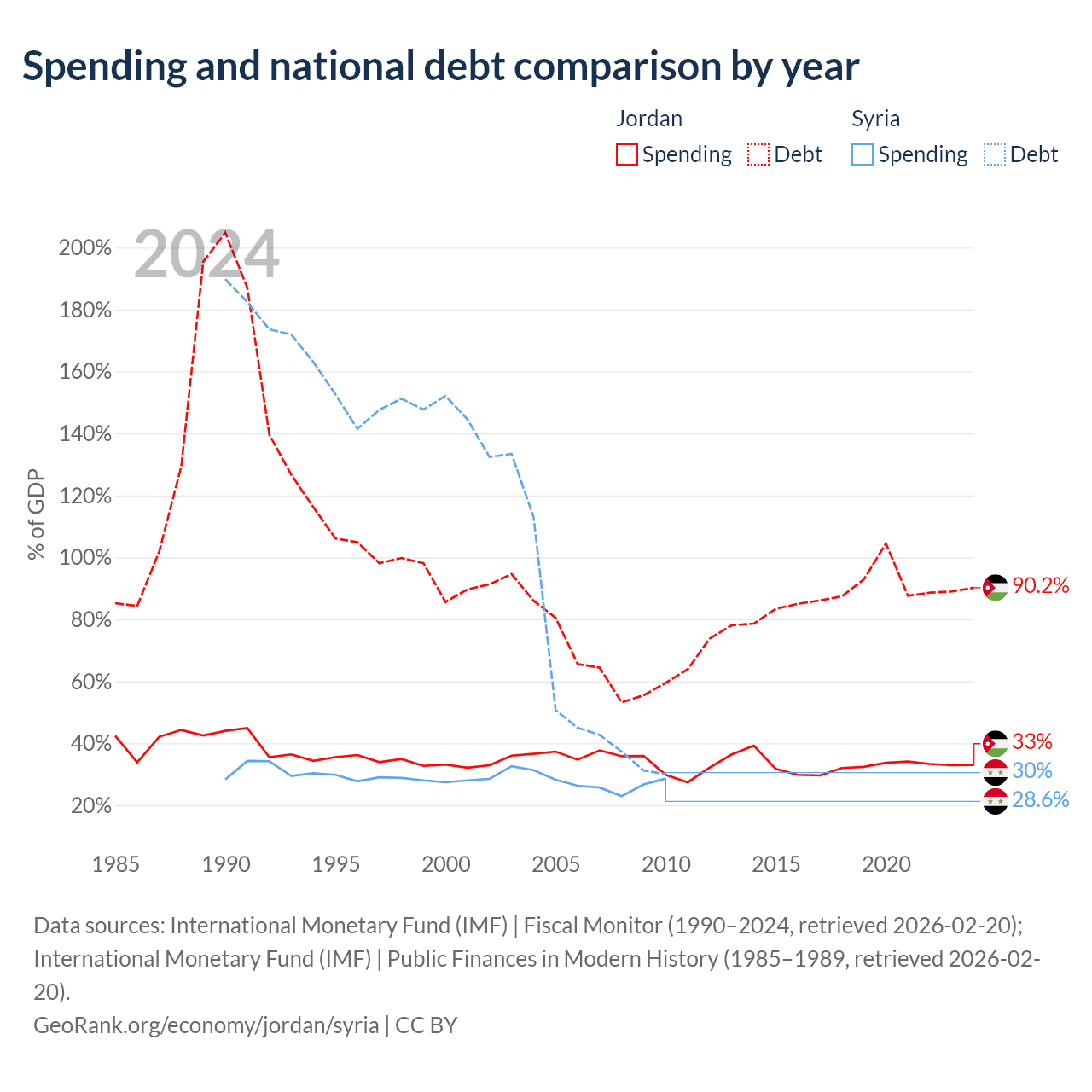 Jordan has $48.1B in government debt (90.2% of GDP), compared to $18.4B (30% of GDP) in Syria.