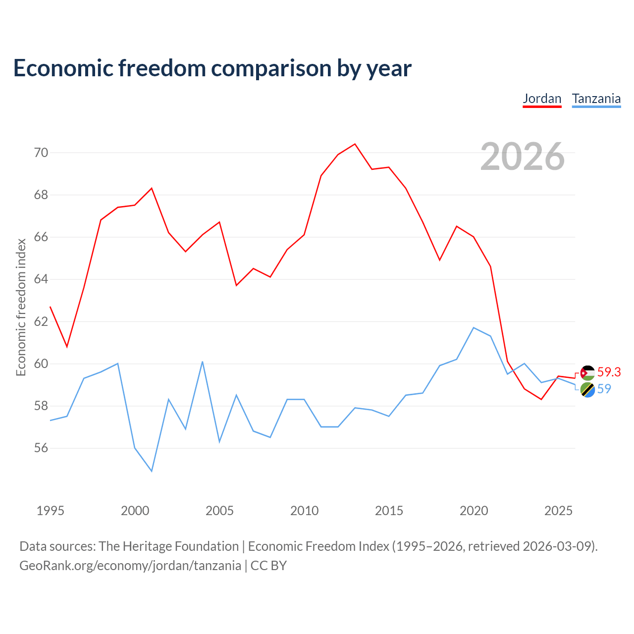 The Economic Freedom Index for Jordan is 59.3, ranking 104/197, compared to 59 for Tanzania, ranking 106/197. The chart above displays a comparison of annual changes in economic freedom indexes.