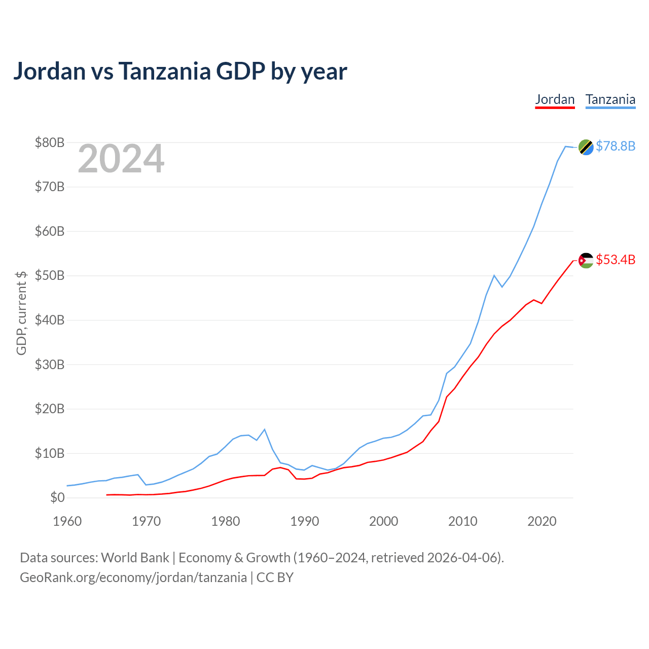 Jordan has a GDP of $53.4B compared to $78.8B for Tanzania, ranking 90/197 and 82/197 by economy size, respectively.