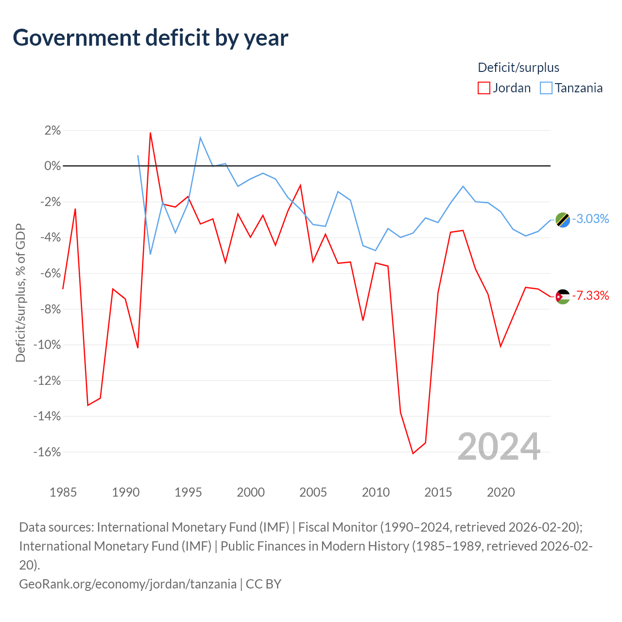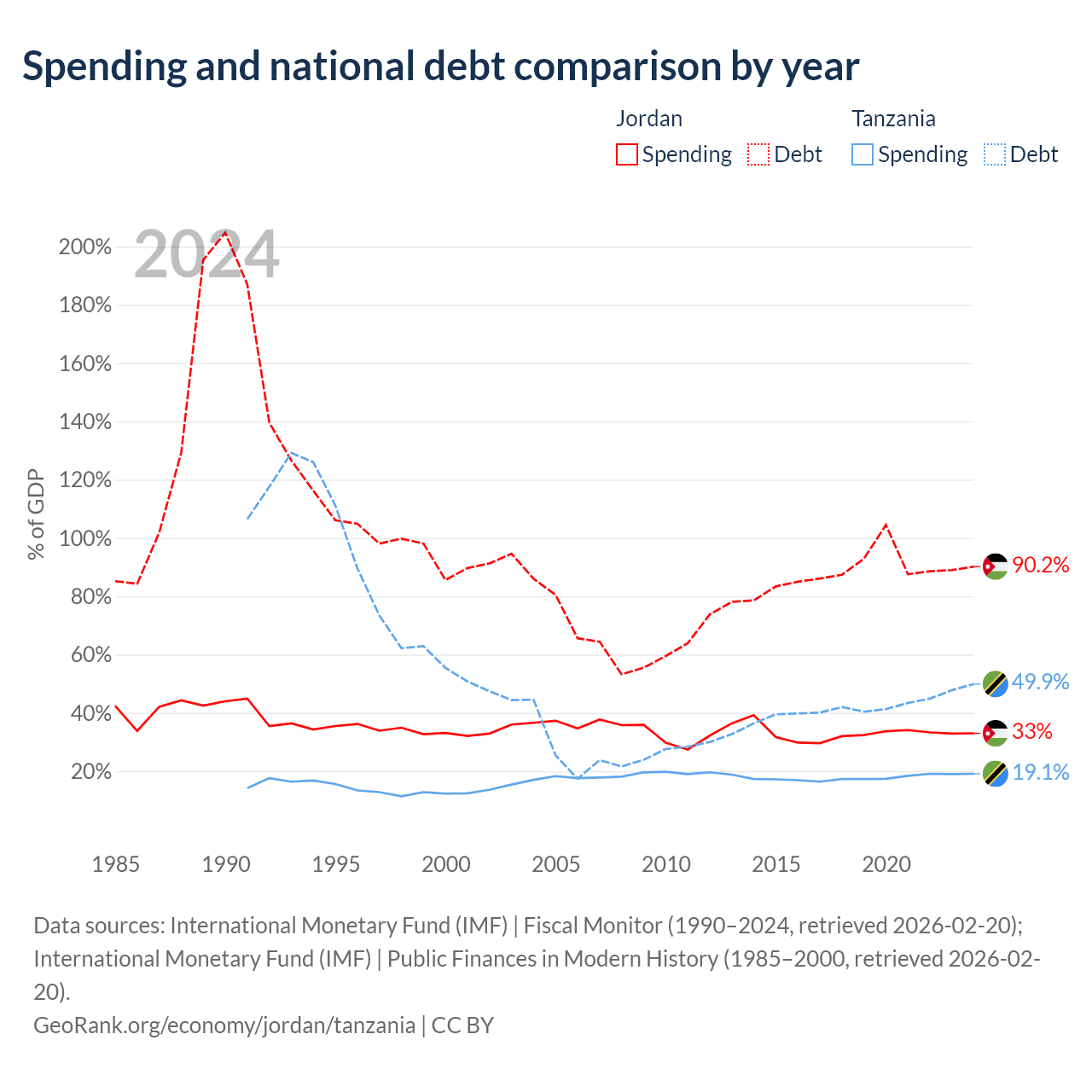 Jordan has $48.1B in government debt (90.2% of GDP), compared to $39.3B (49.9% of GDP) in Tanzania.