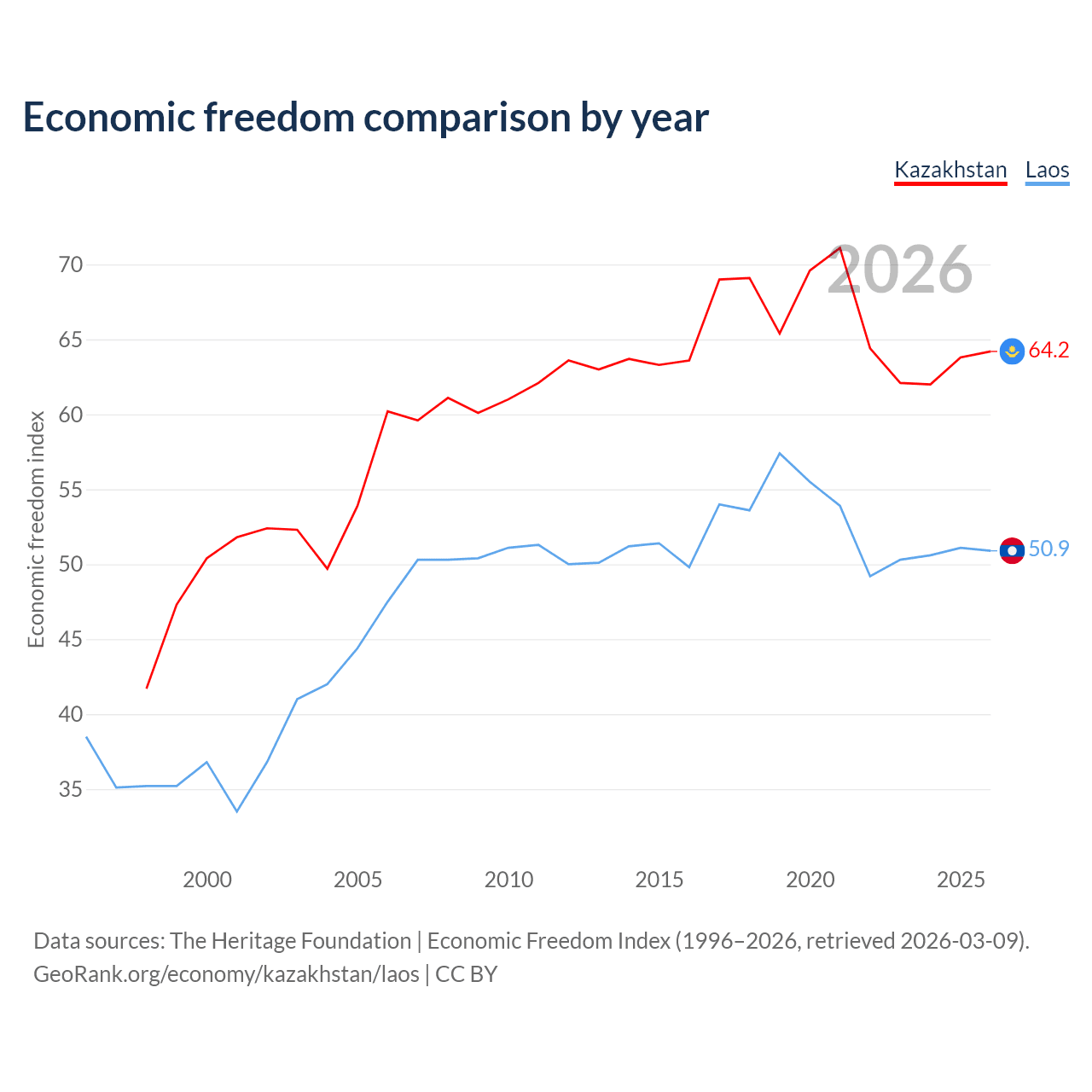 The Economic Freedom Index for Kazakhstan is 64.2, ranking 75/197, compared to 50.9 for Laos, ranking 157/197. The chart above displays a comparison of annual changes in economic freedom indexes.