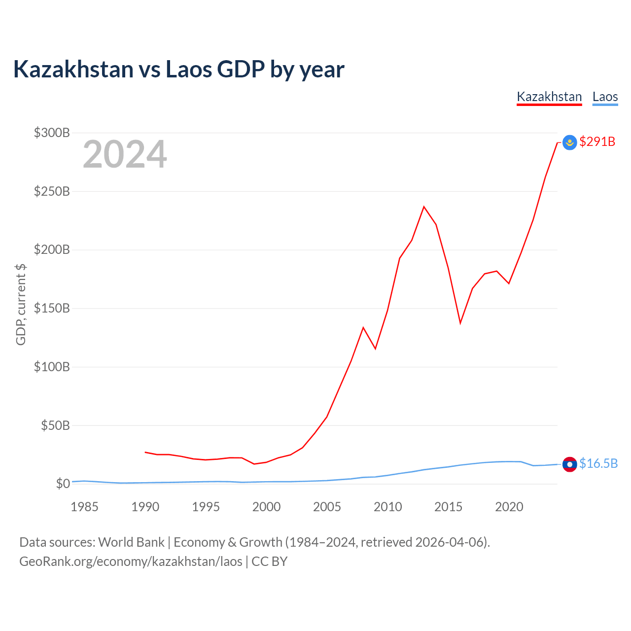 Kazakhstan has a GDP of $291B compared to $16.5B for Laos, ranking 48/197 and 139/197 by economy size, respectively.