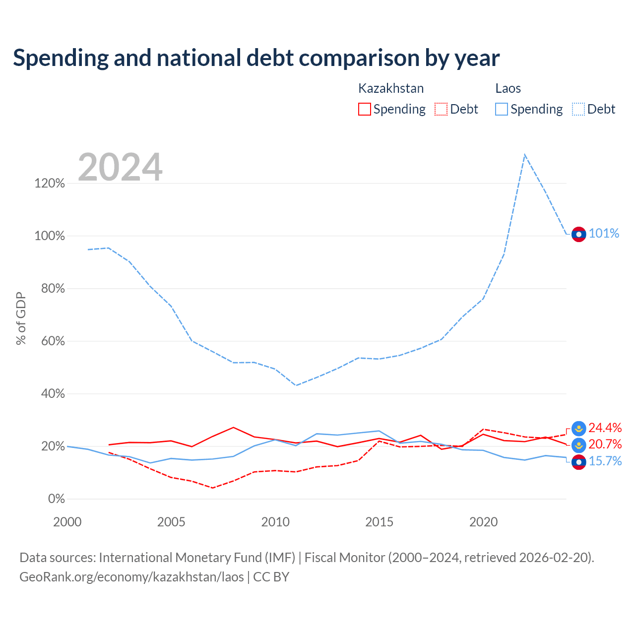 Kazakhstan has $71.1B in government debt (24.4% of GDP), compared to $16.6B (100.5% of GDP) in Laos.