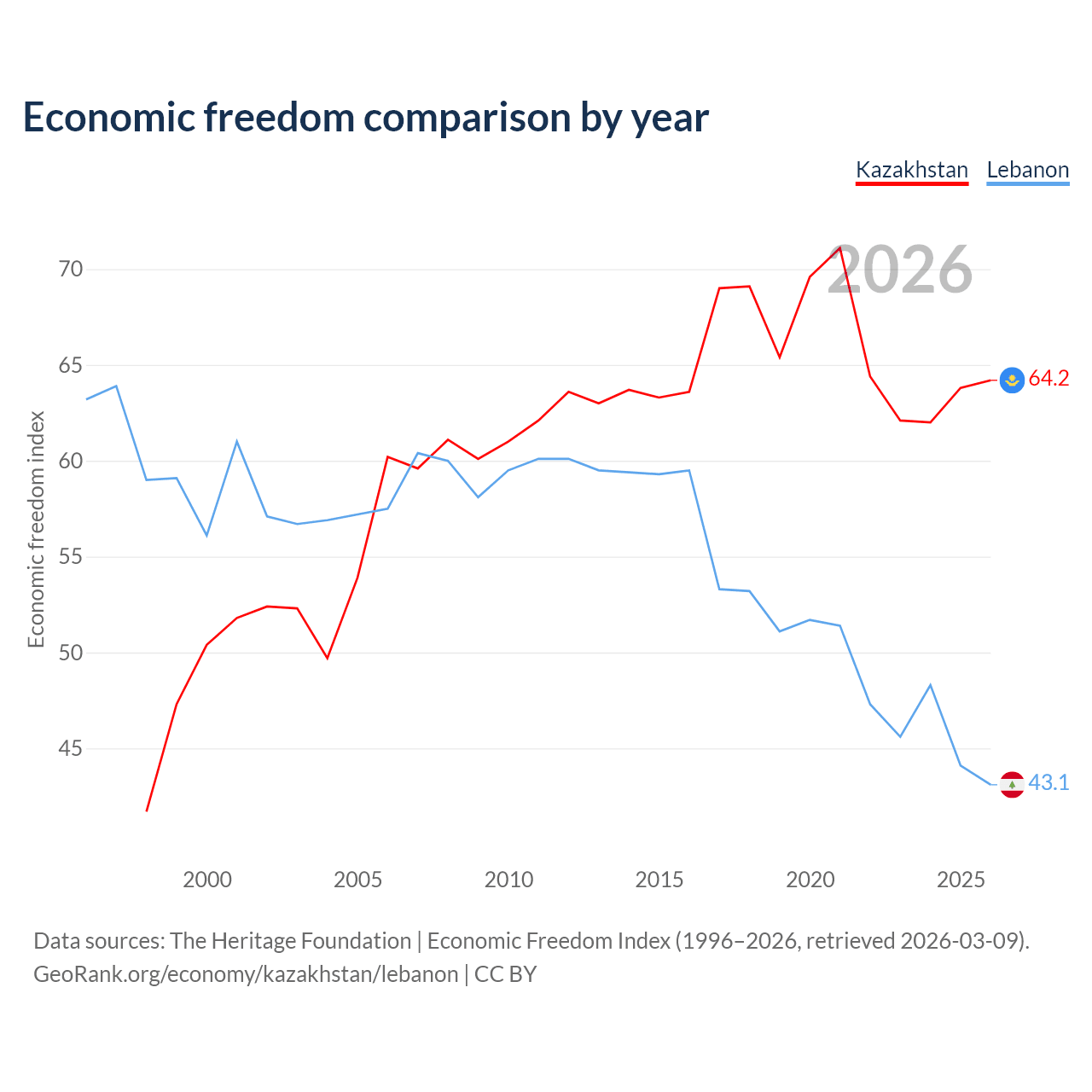 The Economic Freedom Index for Kazakhstan is 64.2, ranking 75/197, compared to 43.1 for Lebanon, ranking 183/197. The chart above displays a comparison of annual changes in economic freedom indexes.