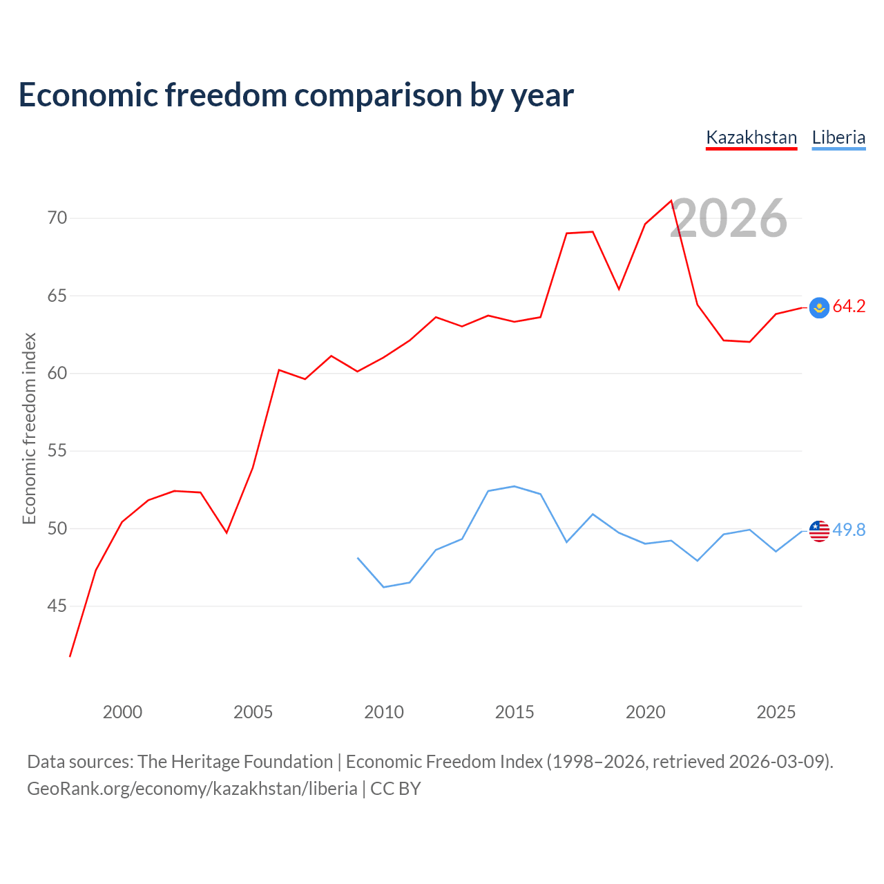 The Economic Freedom Index for Kazakhstan is 64.2, ranking 75/197, compared to 49.8 for Liberia, ranking 163/197. The chart above displays a comparison of annual changes in economic freedom indexes.