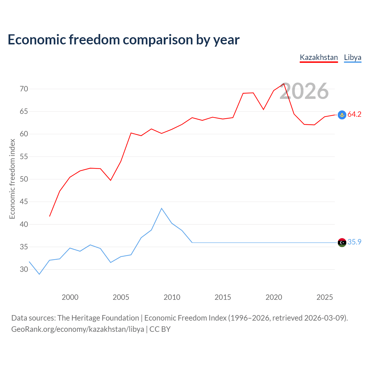 The Economic Freedom Index for Kazakhstan is 64.2, ranking 75/197, compared to 35.9 for Libya, ranking 189/197. The chart above displays a comparison of annual changes in economic freedom indexes.