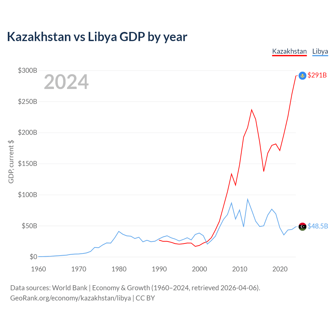 Kazakhstan has a GDP of $291B compared to $48.5B for Libya, ranking 48/197 and 95/197 by economy size, respectively.
