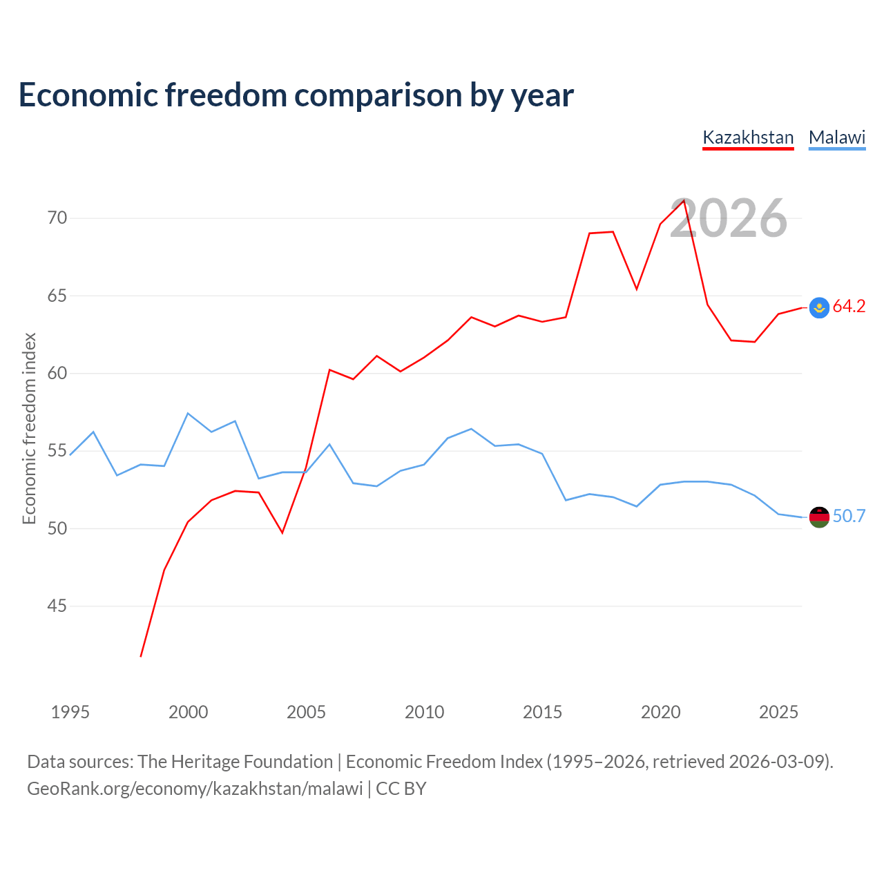 The Economic Freedom Index for Kazakhstan is 64.2, ranking 75/197, compared to 50.7 for Malawi, ranking 159/197. The chart above displays a comparison of annual changes in economic freedom indexes.