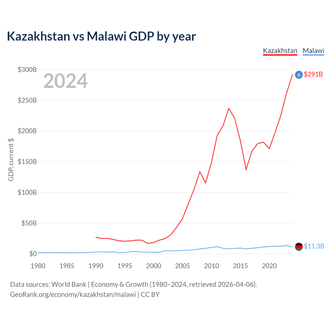 Kazakhstan has a GDP of $291B compared to $11.3B for Malawi, ranking 48/197 and 151/197 by economy size, respectively.