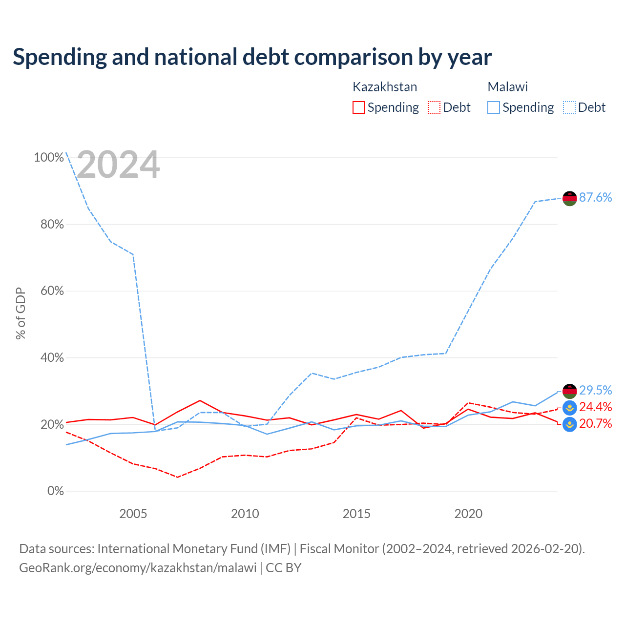 Kazakhstan has $71.1B in government debt (24.4% of GDP), compared to $9.91B (87.6% of GDP) in Malawi.