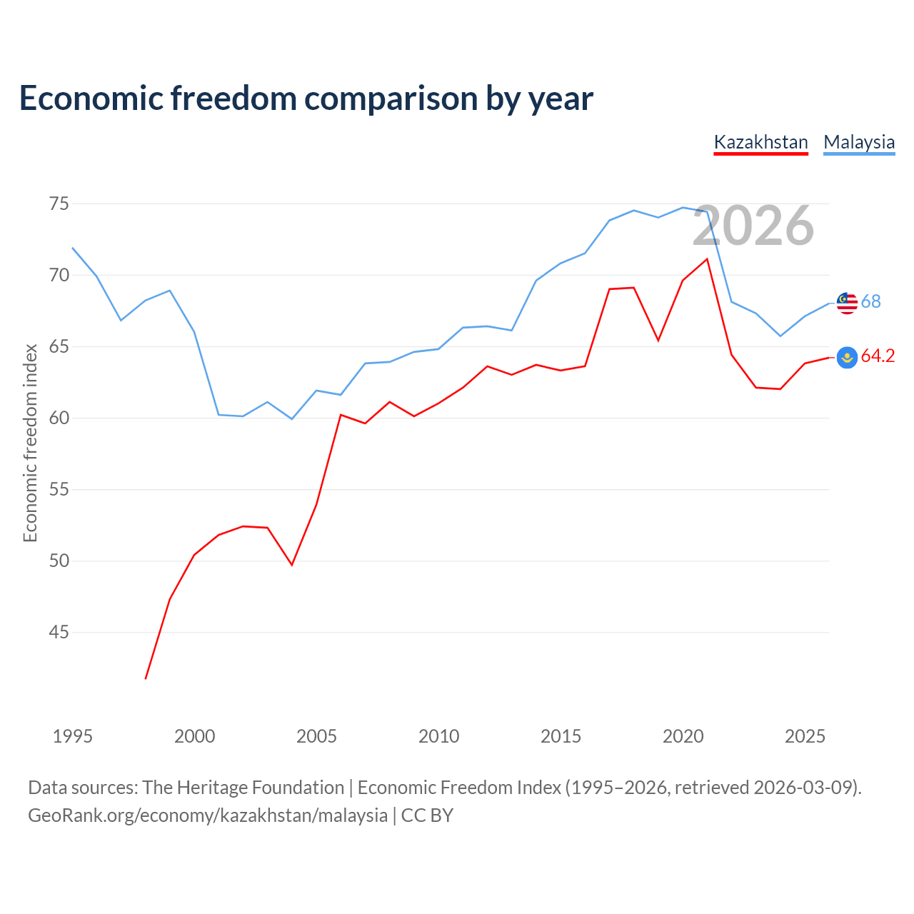 The Economic Freedom Index for Kazakhstan is 64.2, ranking 75/197, compared to 68 for Malaysia, ranking 51/197. The chart above displays a comparison of annual changes in economic freedom indexes.