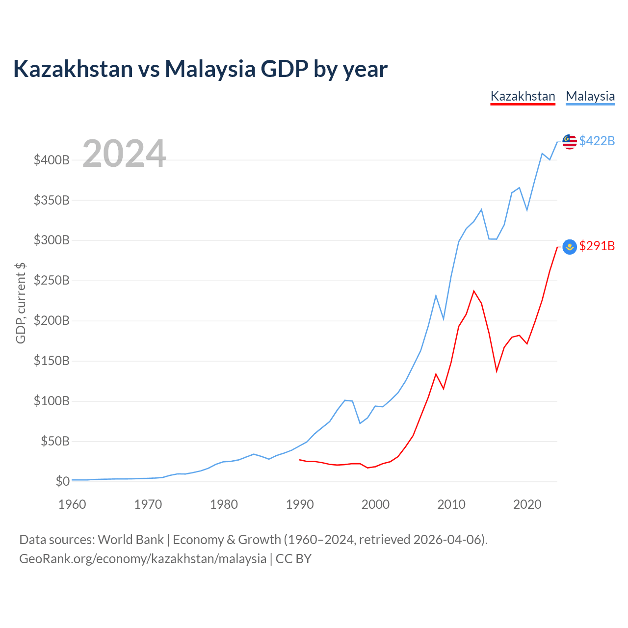 Kazakhstan has a GDP of $291B compared to $422B for Malaysia, ranking 48/197 and 38/197 by economy size, respectively.
