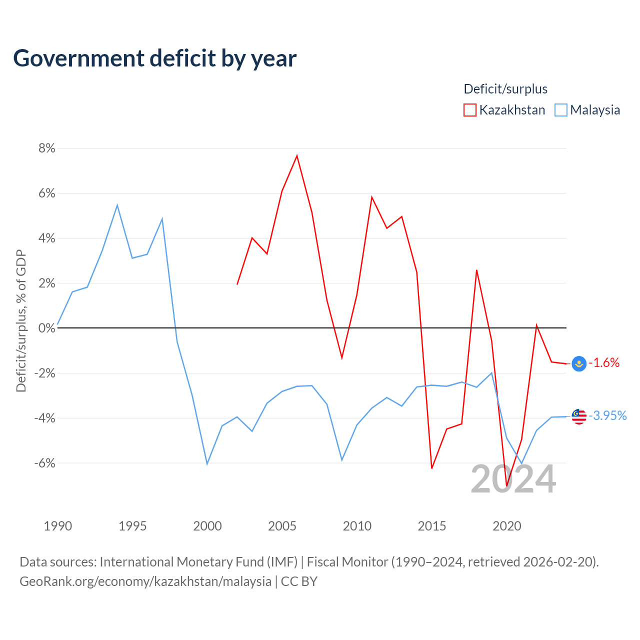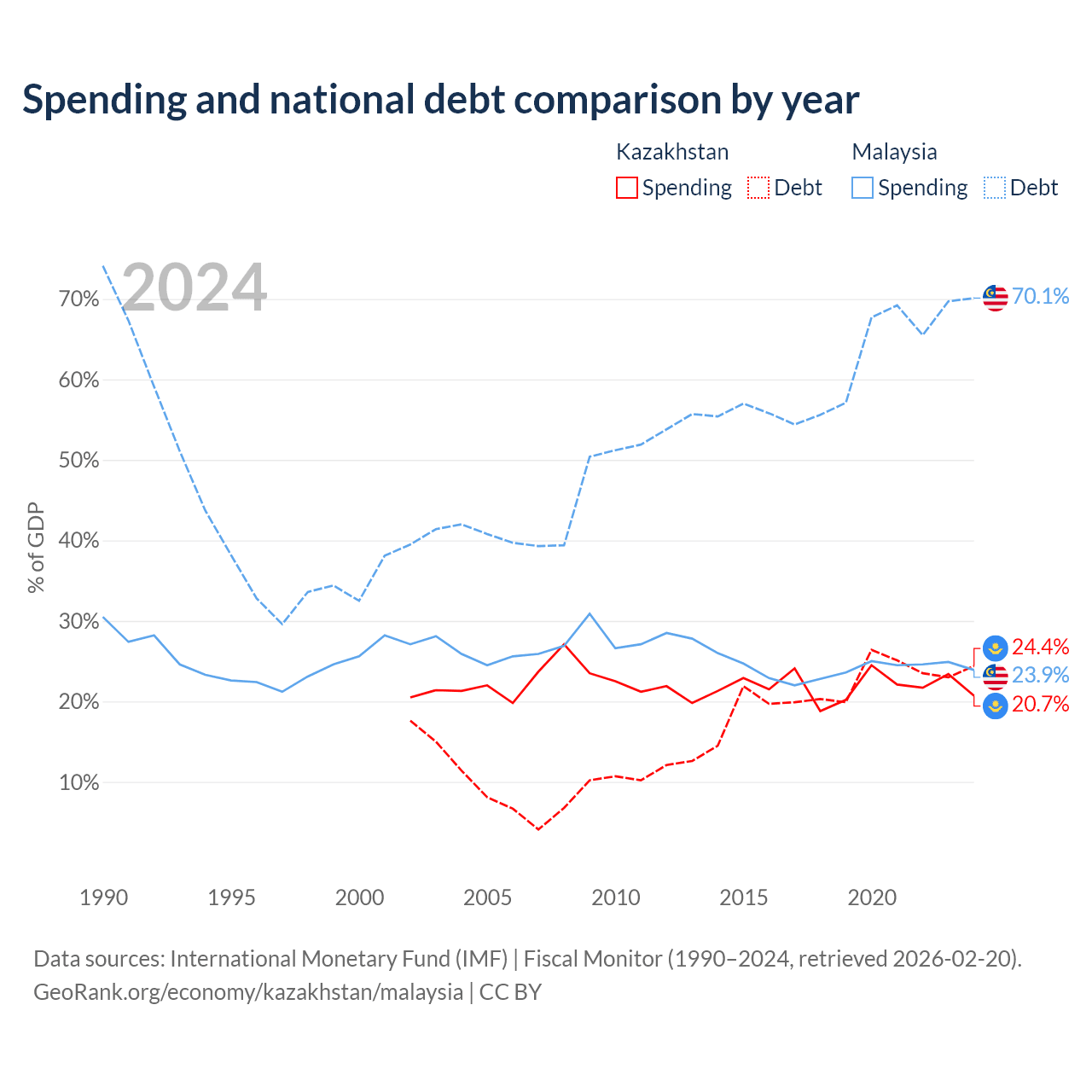 Kazakhstan has $71.1B in government debt (24.4% of GDP), compared to $296B (70.1% of GDP) in Malaysia.