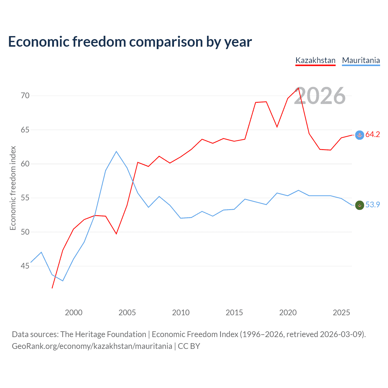 The Economic Freedom Index for Kazakhstan is 64.2, ranking 75/197, compared to 53.9 for Mauritania, ranking 136/197. The chart above displays a comparison of annual changes in economic freedom indexes.