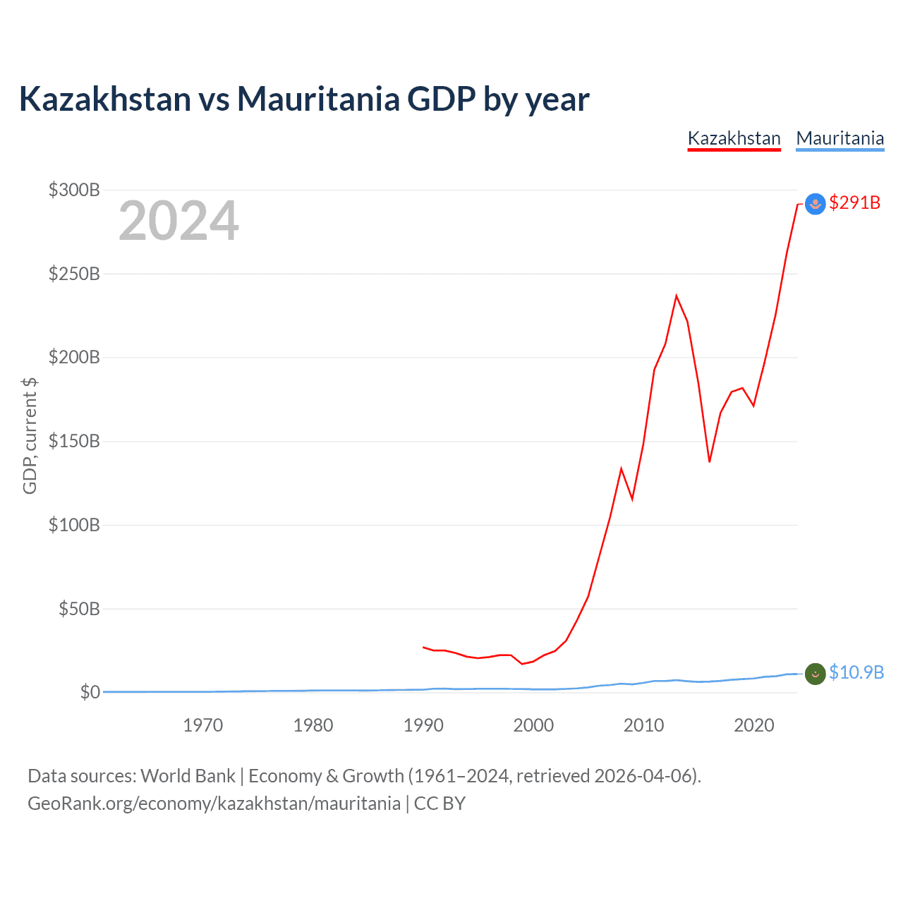 Kazakhstan has a GDP of $291B compared to $10.9B for Mauritania, ranking 48/197 and 153/197 by economy size, respectively.