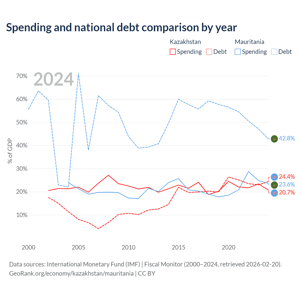 Kazakhstan has $71.1B in government debt (24.4% of GDP), compared to $4.67B (42.8% of GDP) in Mauritania.