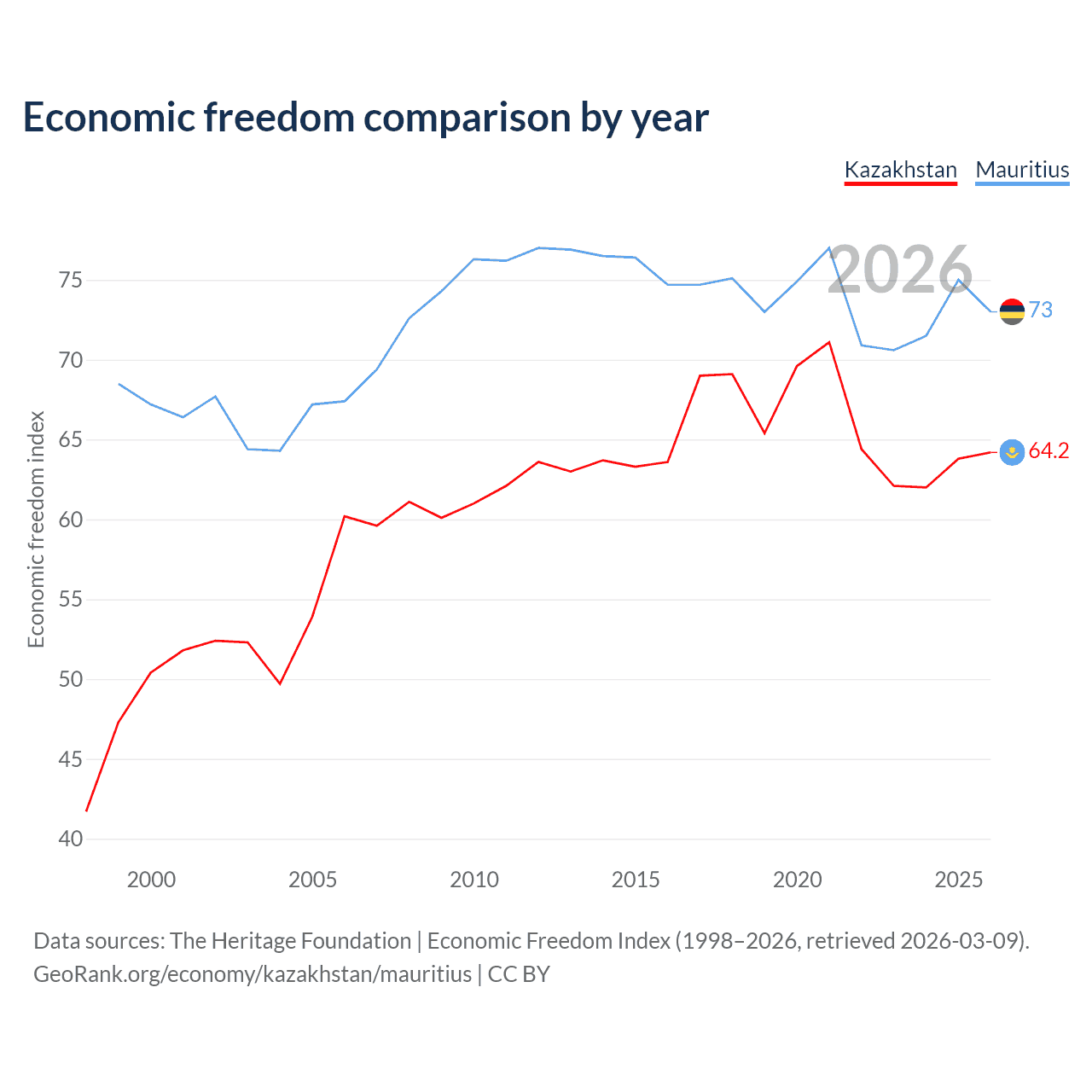 The Economic Freedom Index for Kazakhstan is 64.2, ranking 75/197, compared to 73 for Mauritius, ranking 26/197. The chart above displays a comparison of annual changes in economic freedom indexes.