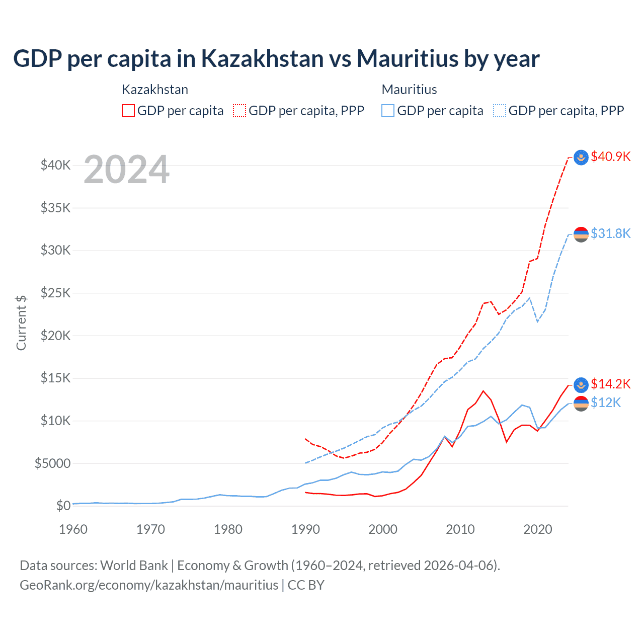 GDP per capita in Kazakhstan vs Mauritius by year