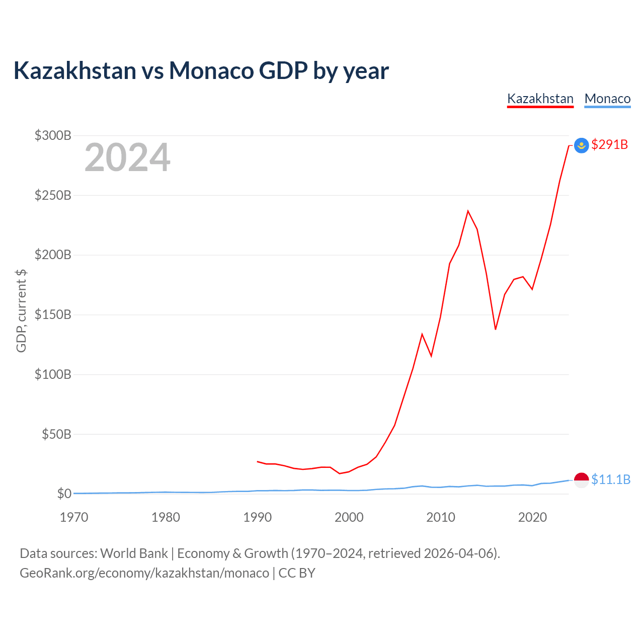 Kazakhstan has a GDP of $291B compared to $11.1B for Monaco, ranking 48/197 and 152/197 by economy size, respectively.