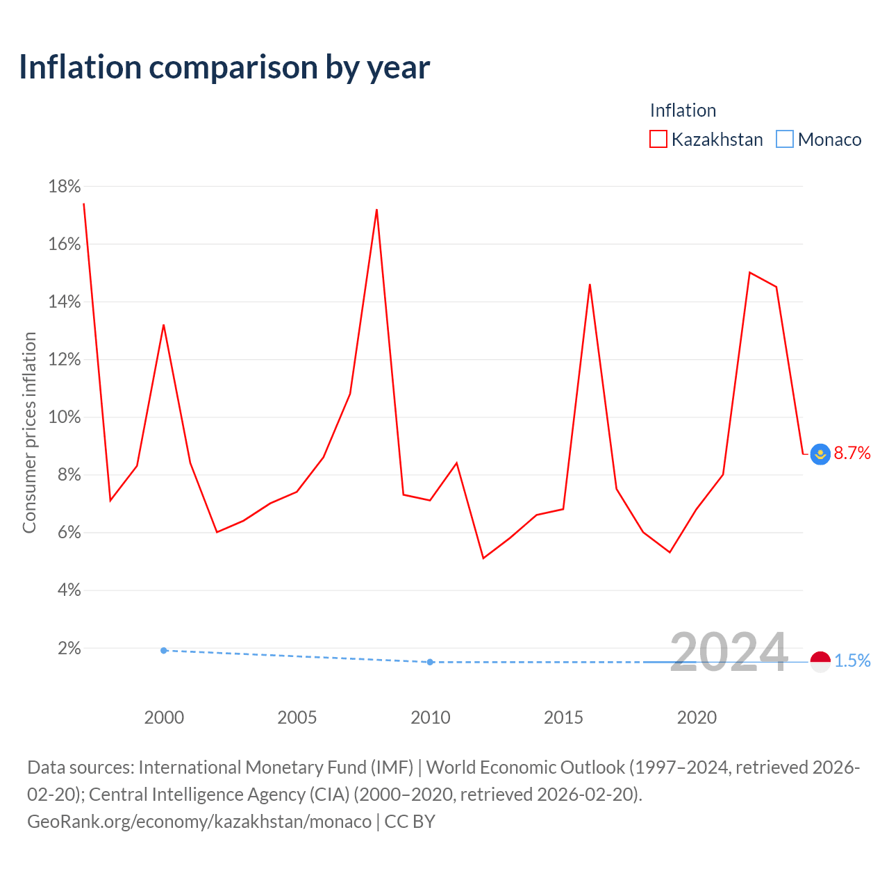 Over the past 21 years, Kazakhstan has recorded an average annual inflation rate of 8.2%, compared with 1.58% in Monaco. In 2020, inflation was 8.7% in Kazakhstan and 1.5% in Monaco.