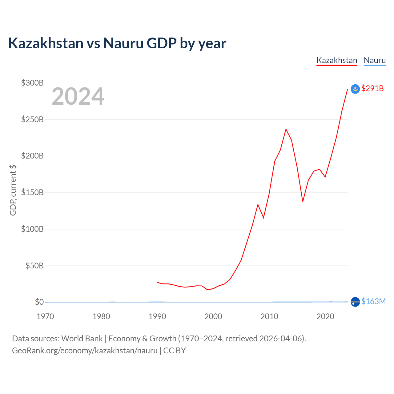 Kazakhstan has a GDP of $291B compared to $163M for Nauru, ranking 48/197 and 195/197 by economy size, respectively.