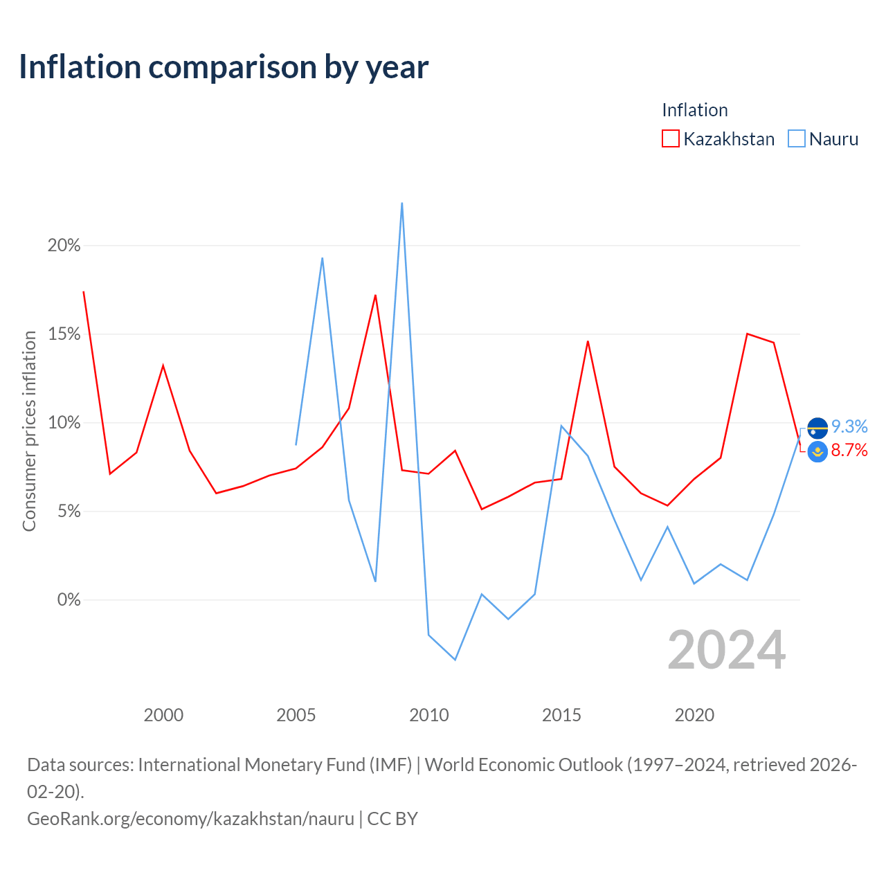 Over the past 20 years, Kazakhstan has recorded an average annual inflation rate of 8.88%, compared with 4.84% in Nauru. In 2024, inflation was 8.7% in Kazakhstan and 9.3% in Nauru.