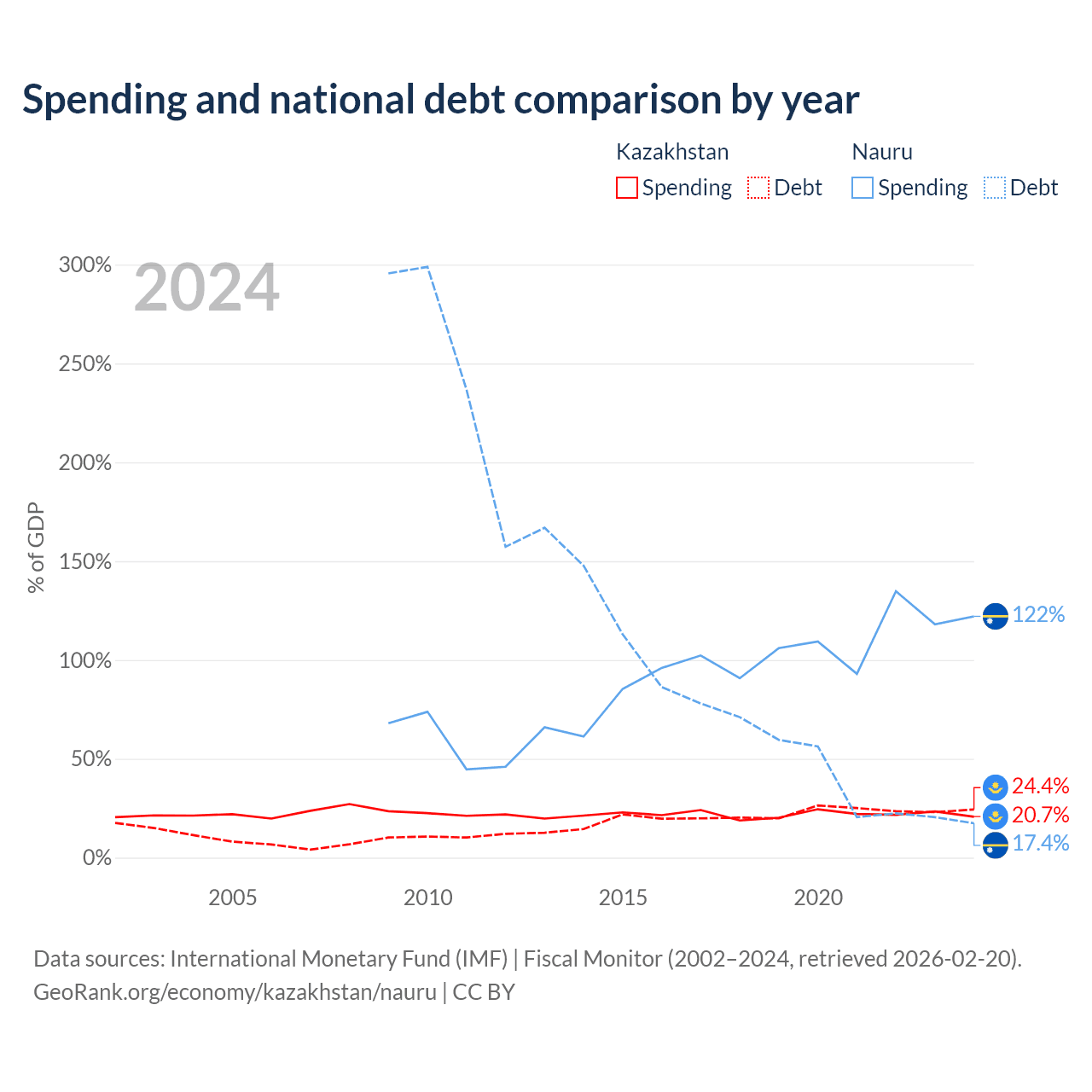 Kazakhstan has $71.1B in government debt (24.4% of GDP), compared to $28.3M (17.4% of GDP) in Nauru.