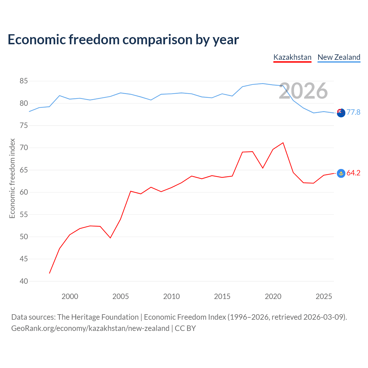 The Economic Freedom Index for Kazakhstan is 64.2, ranking 75/197, compared to 77.8 for New Zealand, ranking 13/197. The chart above displays a comparison of annual changes in economic freedom indexes.