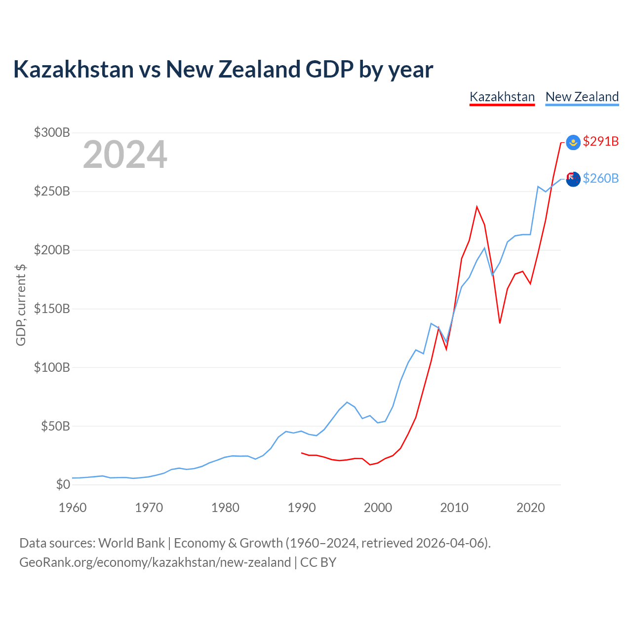 Kazakhstan has a GDP of $291B compared to $260B for New Zealand, ranking 48/197 and 52/197 by economy size, respectively.