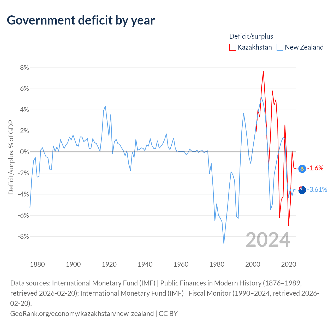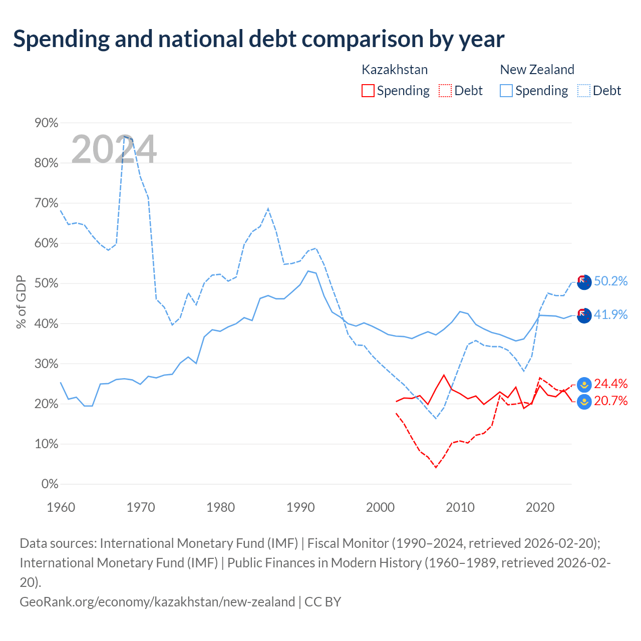 Kazakhstan has $71.1B in government debt (24.4% of GDP), compared to $131B (50.2% of GDP) in New Zealand.