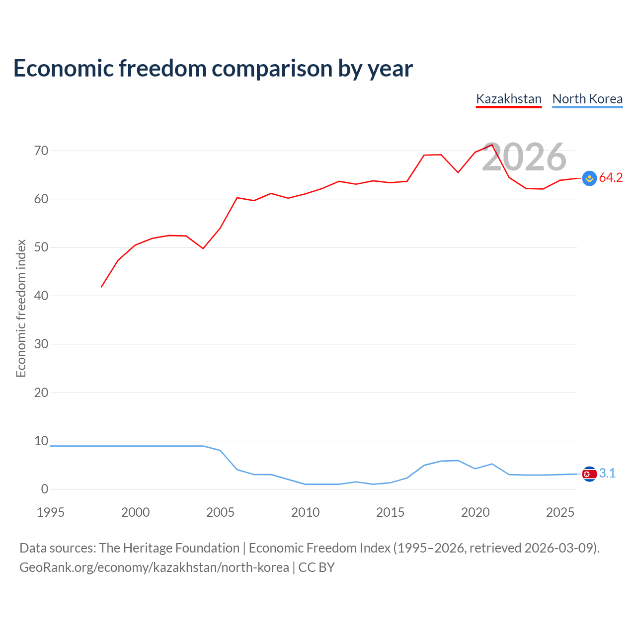 The Economic Freedom Index for Kazakhstan is 64.2, ranking 75/197, compared to 3.1 for North Korea, ranking 197/197. The chart above displays a comparison of annual changes in economic freedom indexes.