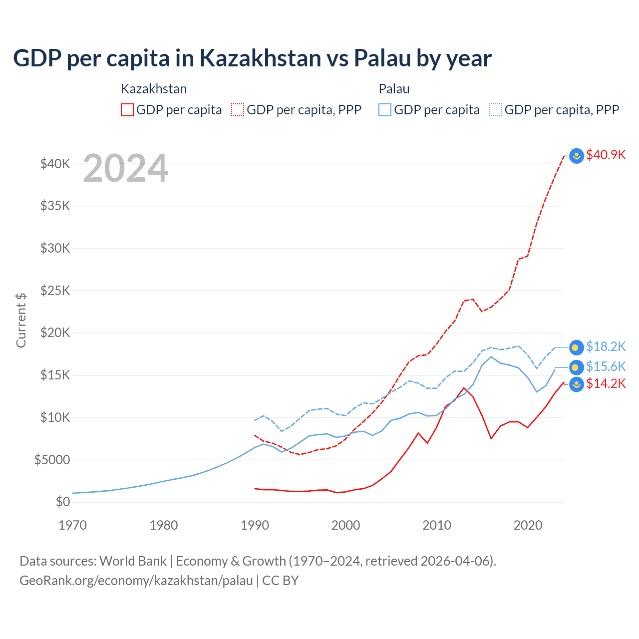 GDP per capita in Kazakhstan vs Palau by year