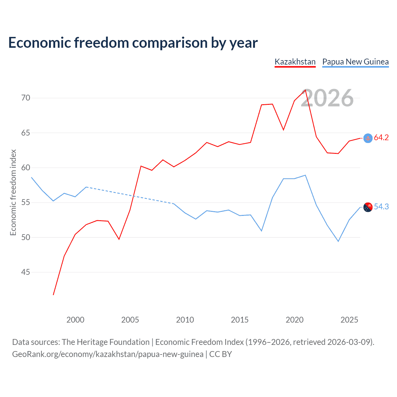 The Economic Freedom Index for Kazakhstan is 64.2, ranking 75/197, compared to 54.3 for Papua New Guinea, ranking 134/197. The chart above displays a comparison of annual changes in economic freedom indexes.