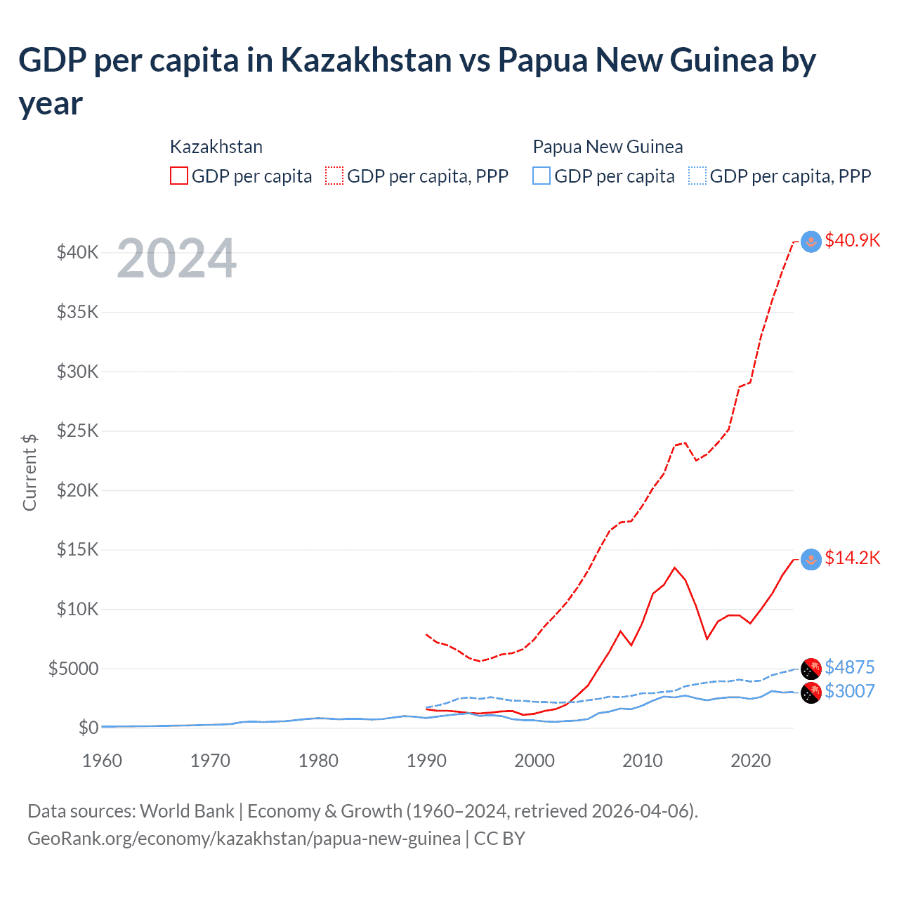GDP per capita in Kazakhstan vs Papua New Guinea by year