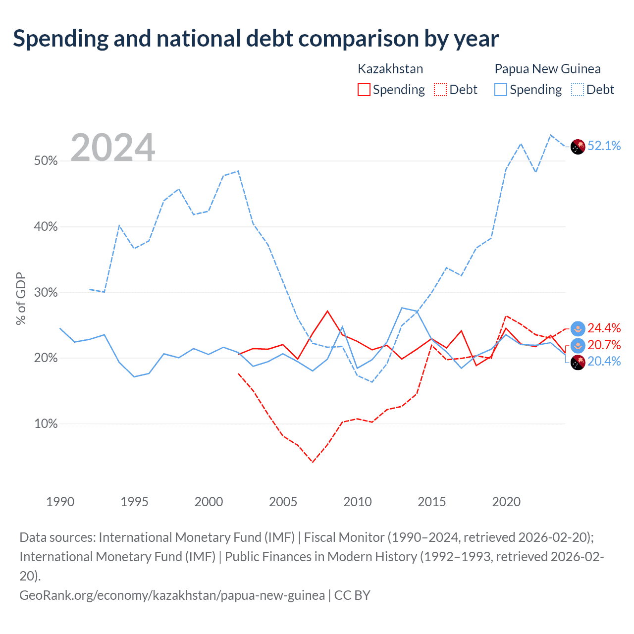 Kazakhstan has $71.1B in government debt (24.4% of GDP), compared to $16.6B (52.1% of GDP) in Papua New Guinea.
