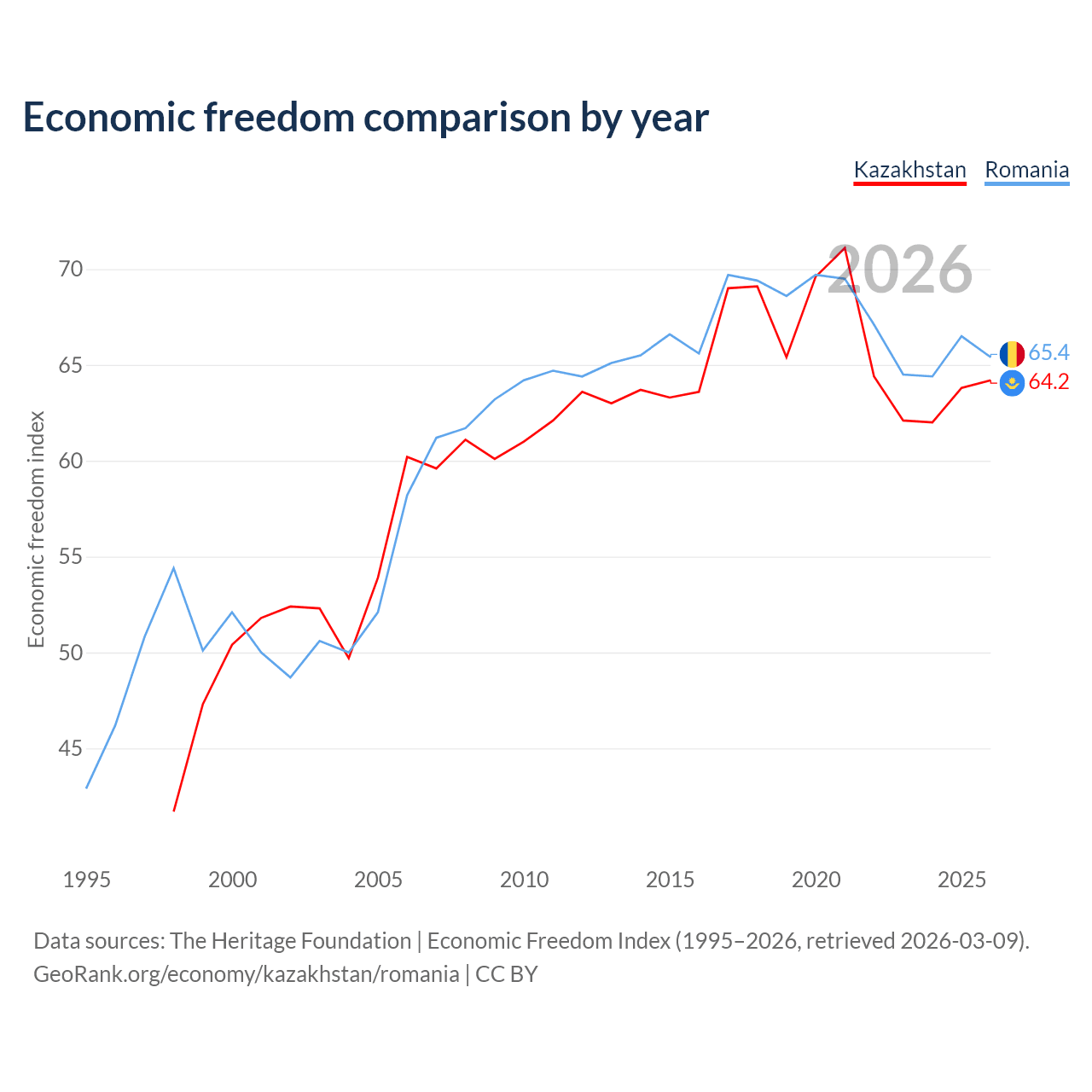 The Economic Freedom Index for Kazakhstan is 64.2, ranking 75/197, compared to 65.4 for Romania, ranking 64/197. The chart above displays a comparison of annual changes in economic freedom indexes.