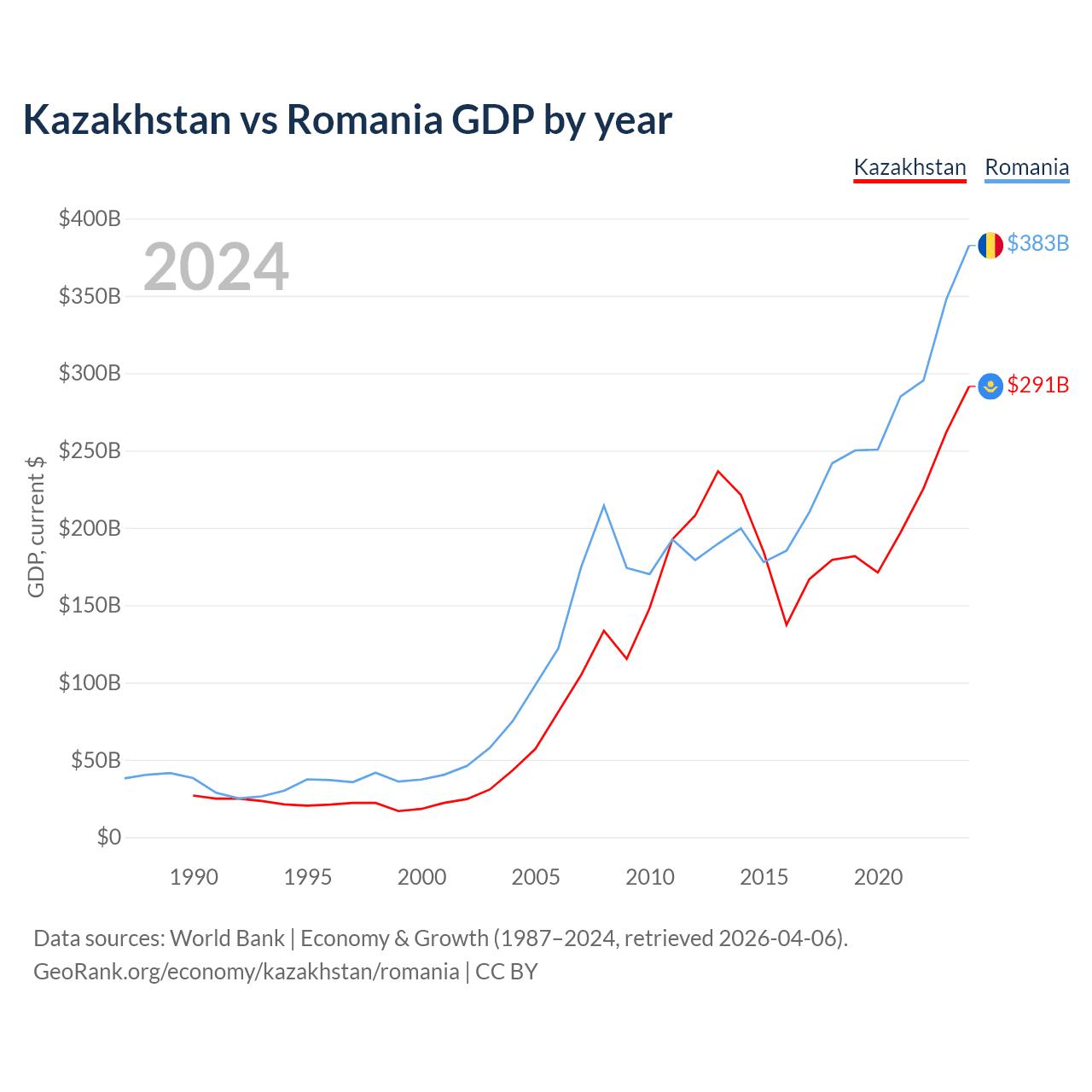 Kazakhstan has a GDP of $291B compared to $383B for Romania, ranking 48/197 and 42/197 by economy size, respectively.