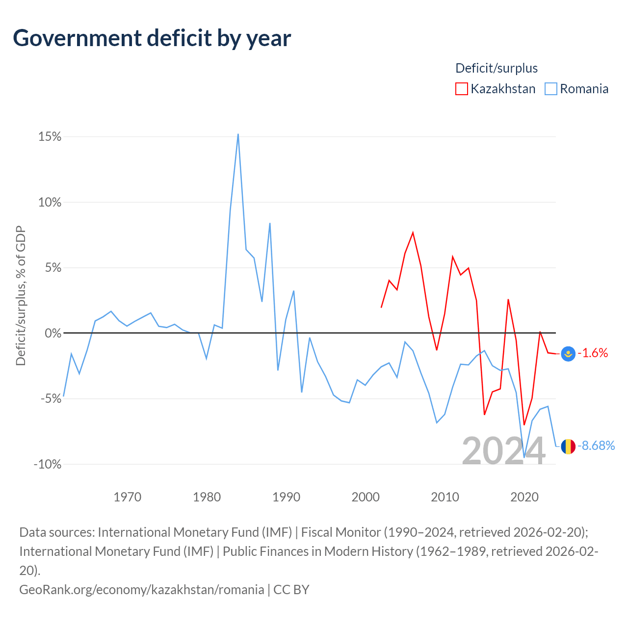 Kazakhstan has $71.1B in government debt (24.4% of GDP), compared to $220B (57.4% of GDP) in Romania.