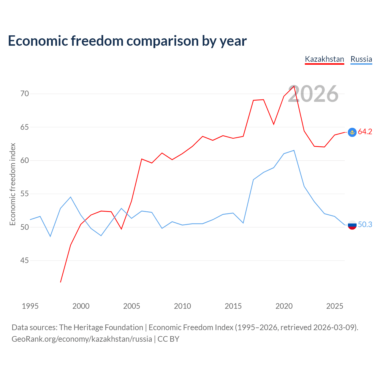 The Economic Freedom Index for Kazakhstan is 64.2, ranking 75/197, compared to 50.3 for Russia, ranking 161/197. The chart above displays a comparison of annual changes in economic freedom indexes.