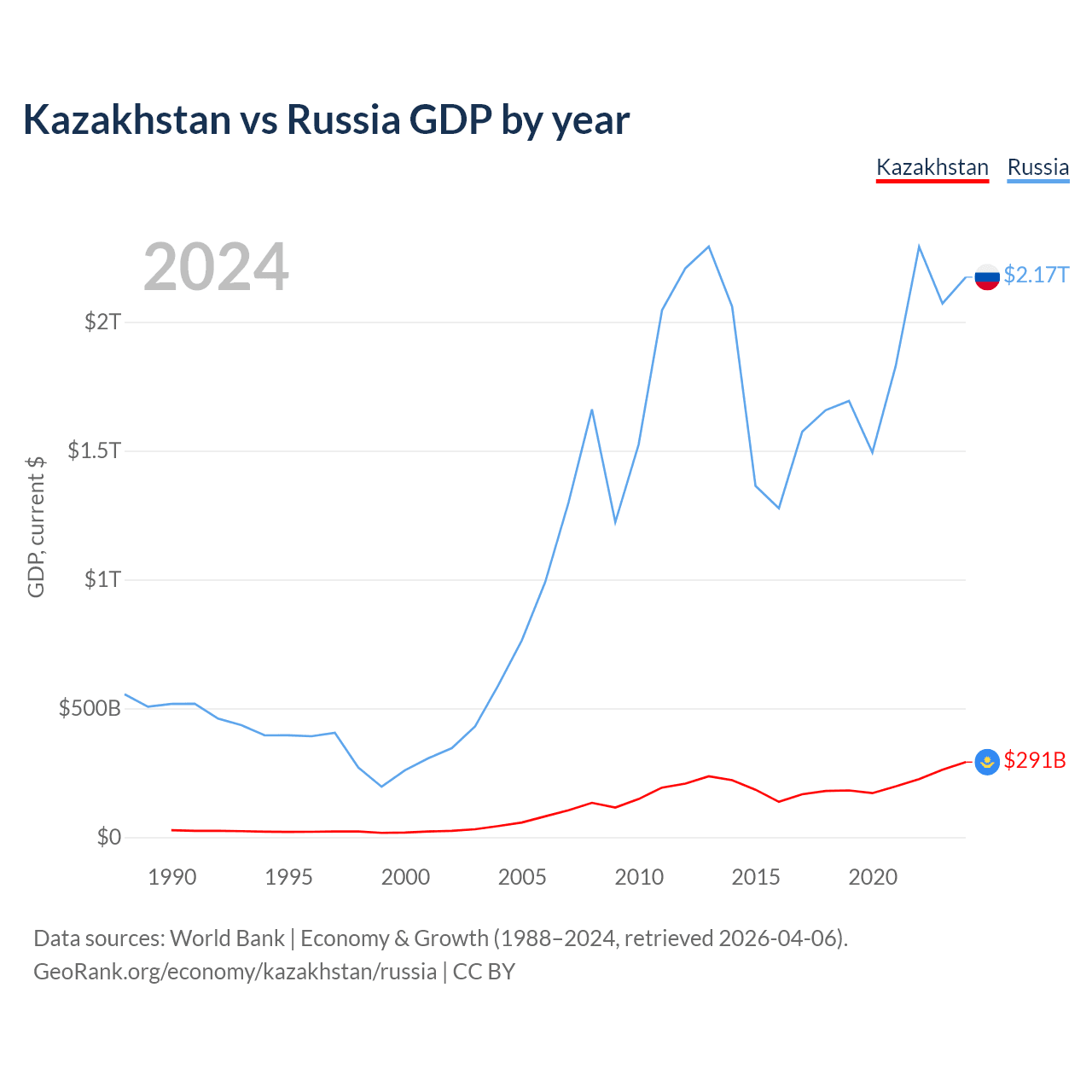 Kazakhstan has a GDP of $291B compared to $2.17T for Russia, ranking 48/197 and 11/197 by economy size, respectively.