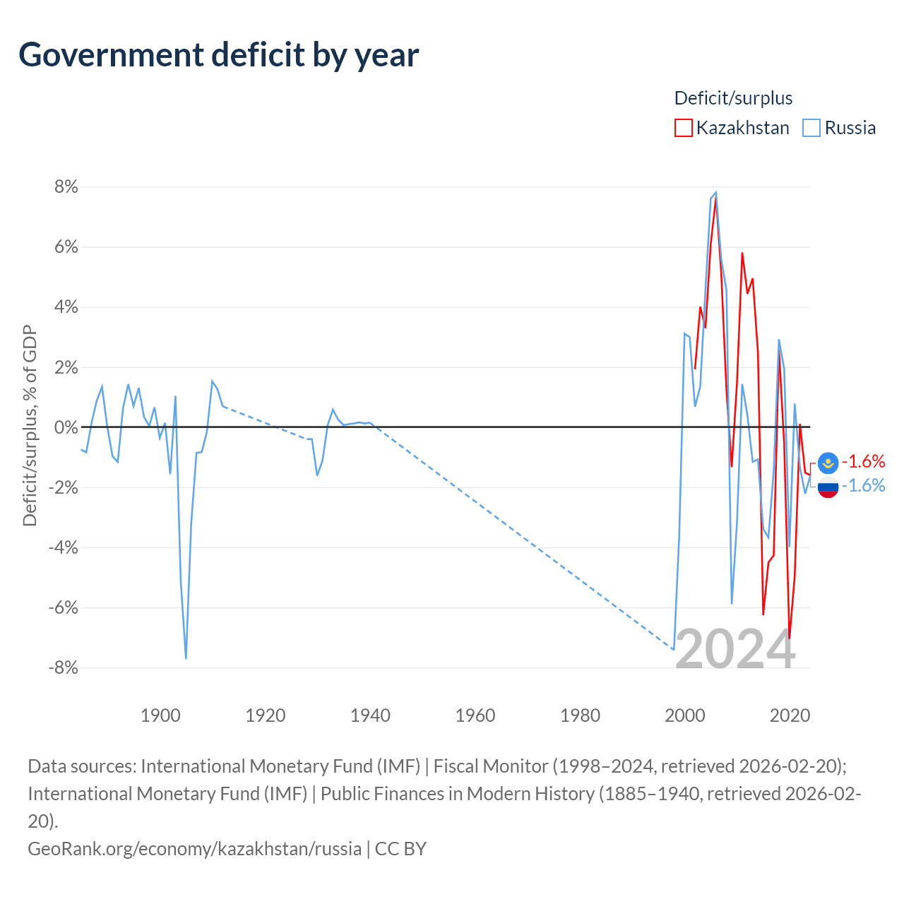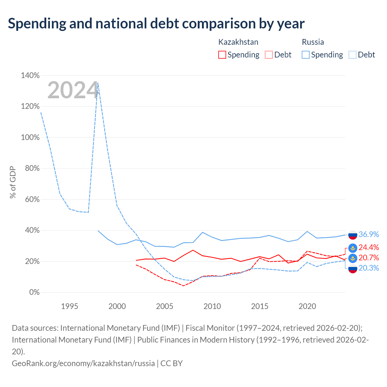 Kazakhstan has $71.1B in government debt (24.4% of GDP), compared to $440B (20.3% of GDP) in Russia.