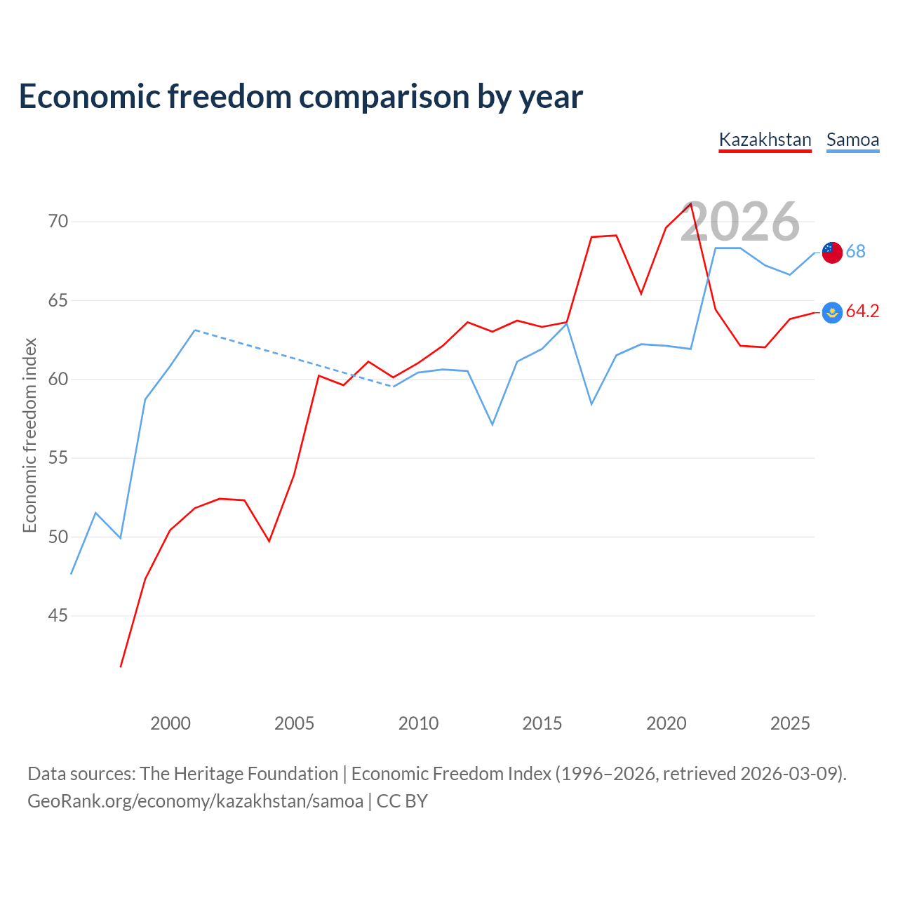 The Economic Freedom Index for Kazakhstan is 64.2, ranking 75/197, compared to 68 for Samoa, ranking 52/197. The chart above displays a comparison of annual changes in economic freedom indexes.